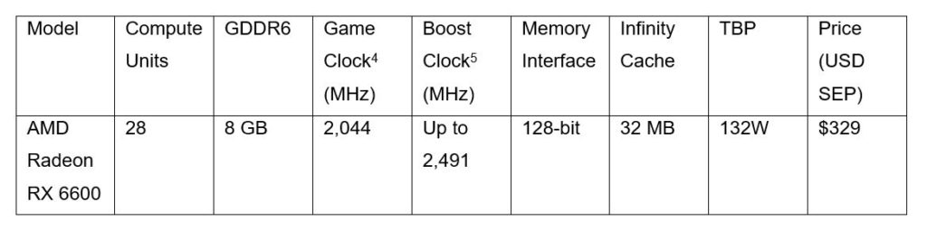 SANTA CLARA, Calif. – October 13, 2021 – AMD ra mắt dòng card đồ họa AMD Radeon™ RX 6600 được thiết kế để cung cấp trải nghiệm chơi game 1080p với tốc độ làm mới cao, hình ảnh tuyệt đẹp cho thị trường tầm trung.