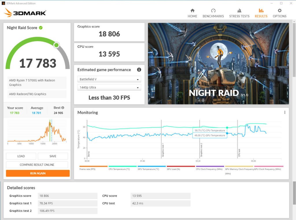 Về GPU tích hợp, khi thử sức với công cụ 3DMark quen thuộc, Ryzen 7 5700G đạt đến 18.806 điểm đồ họa. Phần kết quả chi tiết cũng cho thấy hệ thống chinh phục dễ dàng các bộ test khi đạt 78.34 FPS Graphics test 1 và 106.49 Graphics test 2. Kết quả này cho thấy Ryzen 7 5700G có thể chơi tốt các tựa game online phổ biến tại Việt Nam.