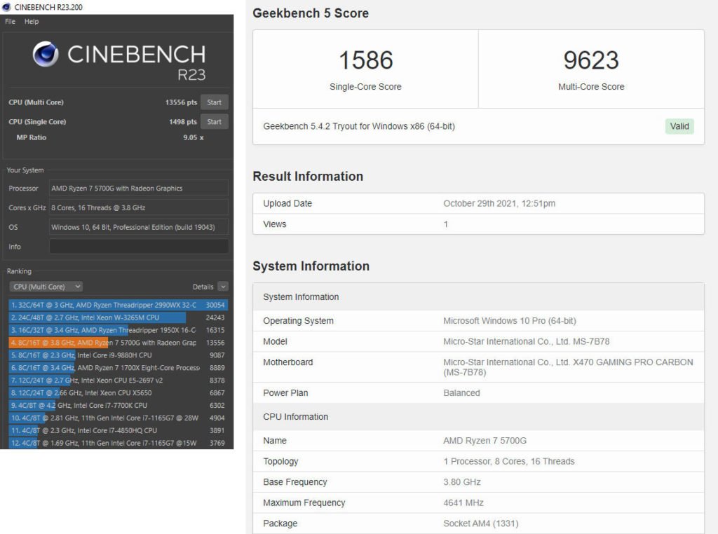 Với 2 công cụ chuyên dụng đo điểm phần hiệu năng CPU là Cinebench R23 và Geekbench 5, Ryzen 7 5700G đã cho thấy sức mạnh phần CPU khá khủng, điểm đa nhân vượt trội so với phiên bản Ryzen 5 5600X (không GPU – 11.358 điểm Cinebench). Với sức mạnh này thì bạn hoàn toàn có thể yên tâm để kết hợp với một chiếc card đồ họa tầm trung mạnh mẽ về sau khi giá card đồ họa hạ nhiệt.