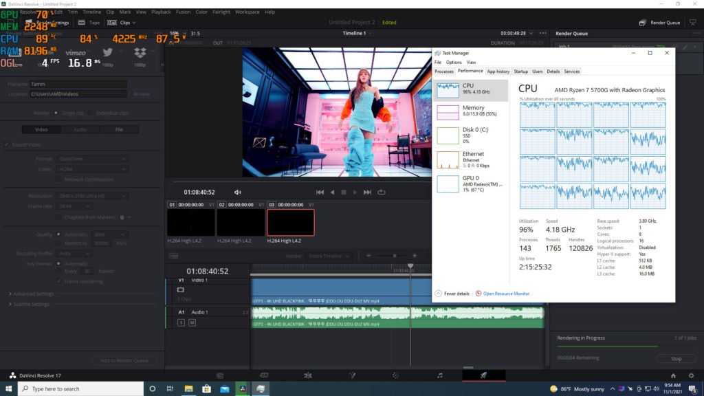 Thời gian render video 4K 60FPS MP4 là 20 phút29 giây cho độ dài thực tế 11p36giây. Do tác vụ render vắt kiệt sức mạnh CPU nên nhiệt độ CPU lúc này lên đến 88-89 độ C, tuy nhiên xung nhịp vẫn ổn định chứ không bị tuột.