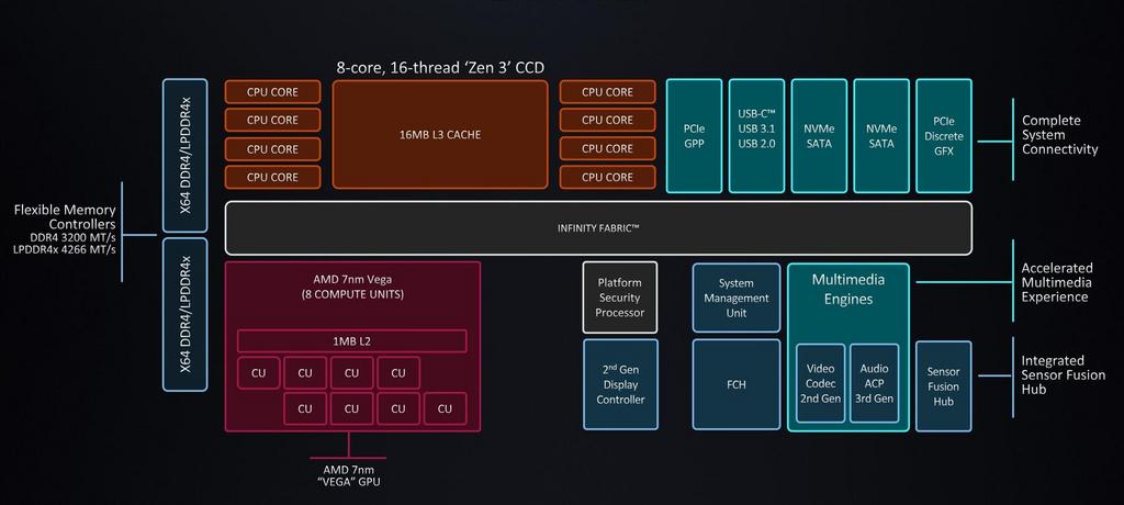 Tuy nhiên dù cùng kiến trúc Zen 3 như các đàn anh cùng dòng 5000 ra mắt gần đây, nhưng các vi xử lý 5000G series có vài điểm khác biệt. Phiên bản 5000G bị rút gọn bớt một số tính năng như chỉ hỗ trợ PCIe 3.0 thay vì 4.0 và bộ nhớ đệm L3 cũng bị giảm một nữa còn 16MB thay vì 32MB (vẫn gấp đôi Ryzen 7 4700G với 8MB cache). Điều này có lẽ do phải dành không gian cho nhân đồ họa GPU cũng như cắt giảm bớt chi phí để dễ tiếp cận người dùng hơn.