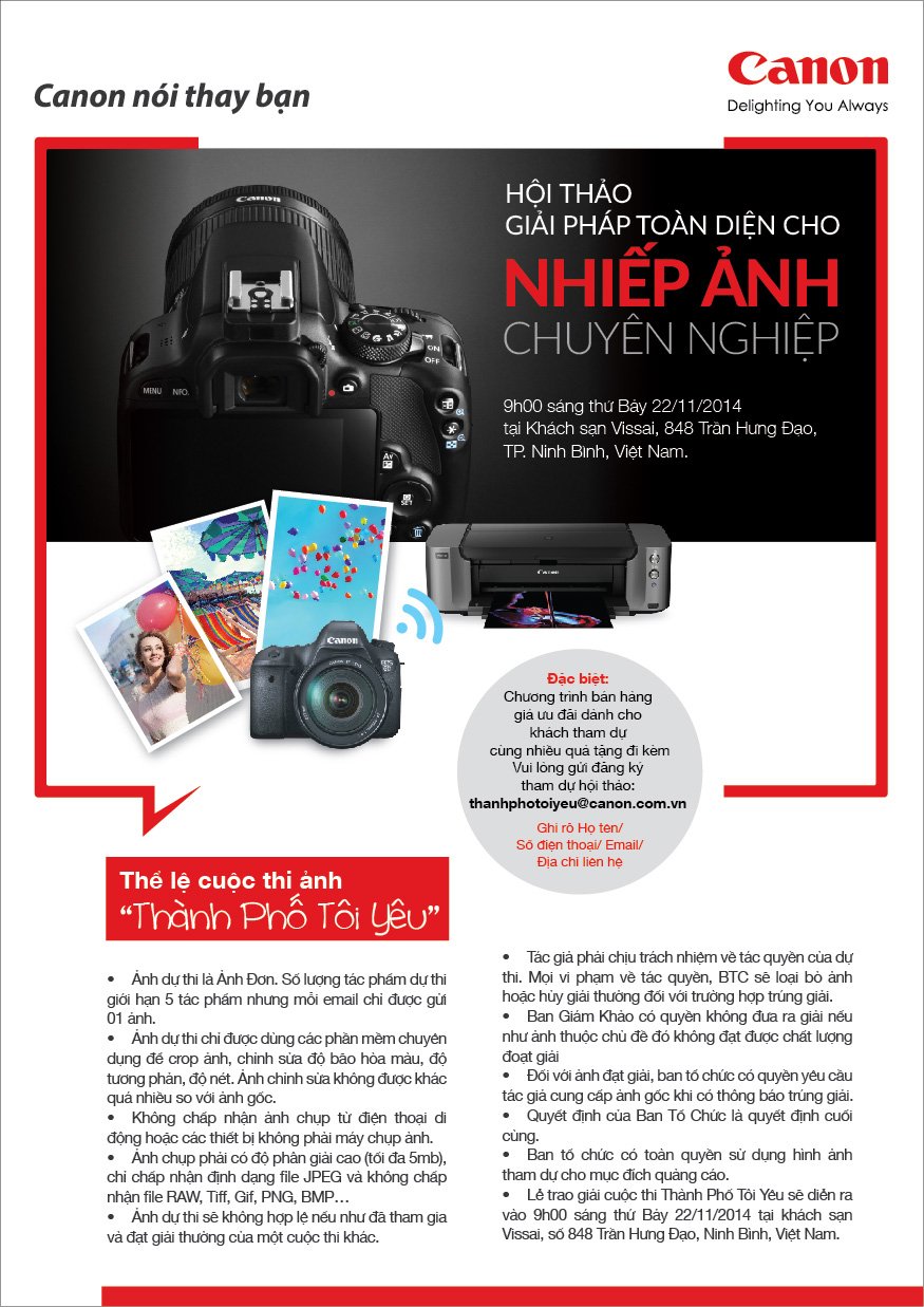 Sau khi tổ chức thành công tại Hải Phòng và Cần Thơ, Canon lại tiếp tục đưa hội thảo “Giải pháp toàn diện cho nhiếp ảnh chuyên nghiệp” đến với người yêu nhiếp ảnh nhiếp ảnh Ninh Bình vào ngày 22/11/2014 tới tại khách sạn Vissai (848 Trần Hưng Đạo). Hoạt động hứa hẹn mang lại nhiều thông tin bổ ích cùng trải nghiệm đầy thú vị cho các nhiếp ảnh gia chuyên và không chuyên nơi đây.